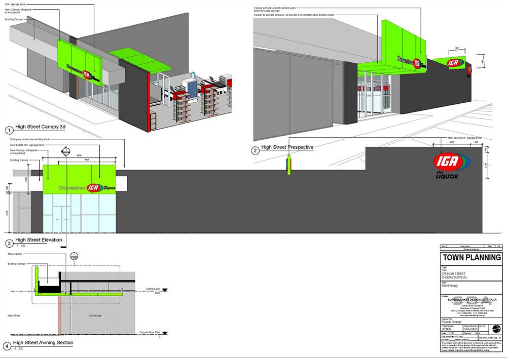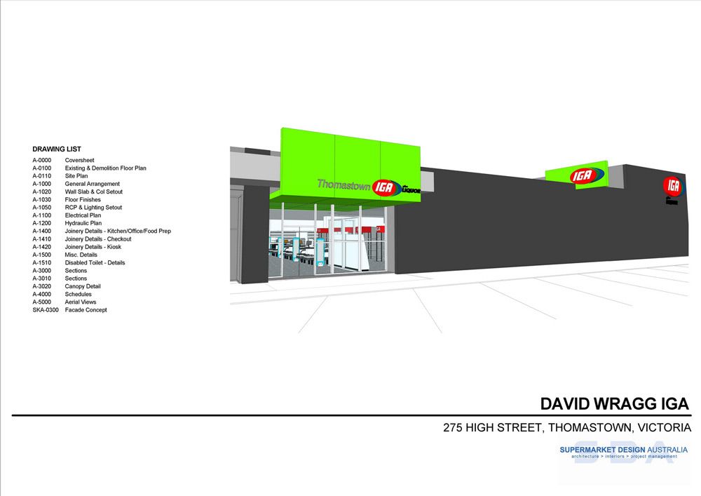 SDA were engaged renovate an existing store for an IGA in Thomastown. The budget allocated was tight however integral to the success of the store was creating a visual presence to the main road. The design achieved this by providing a striking awning elment that created visual entry point and a transition form outside to inside.